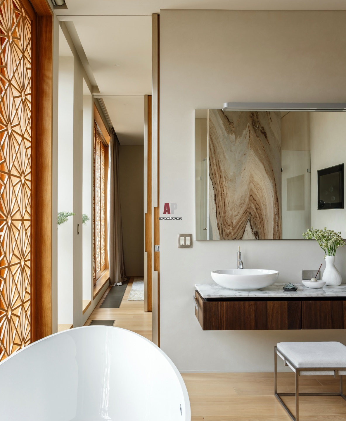 Три этажа пентхауса объединяет общий декоративный мотив – ажурный орнамент в марокканском стиле разного масштаба и техники исполнения. В спальне использованы ажурные деревянные ставни.