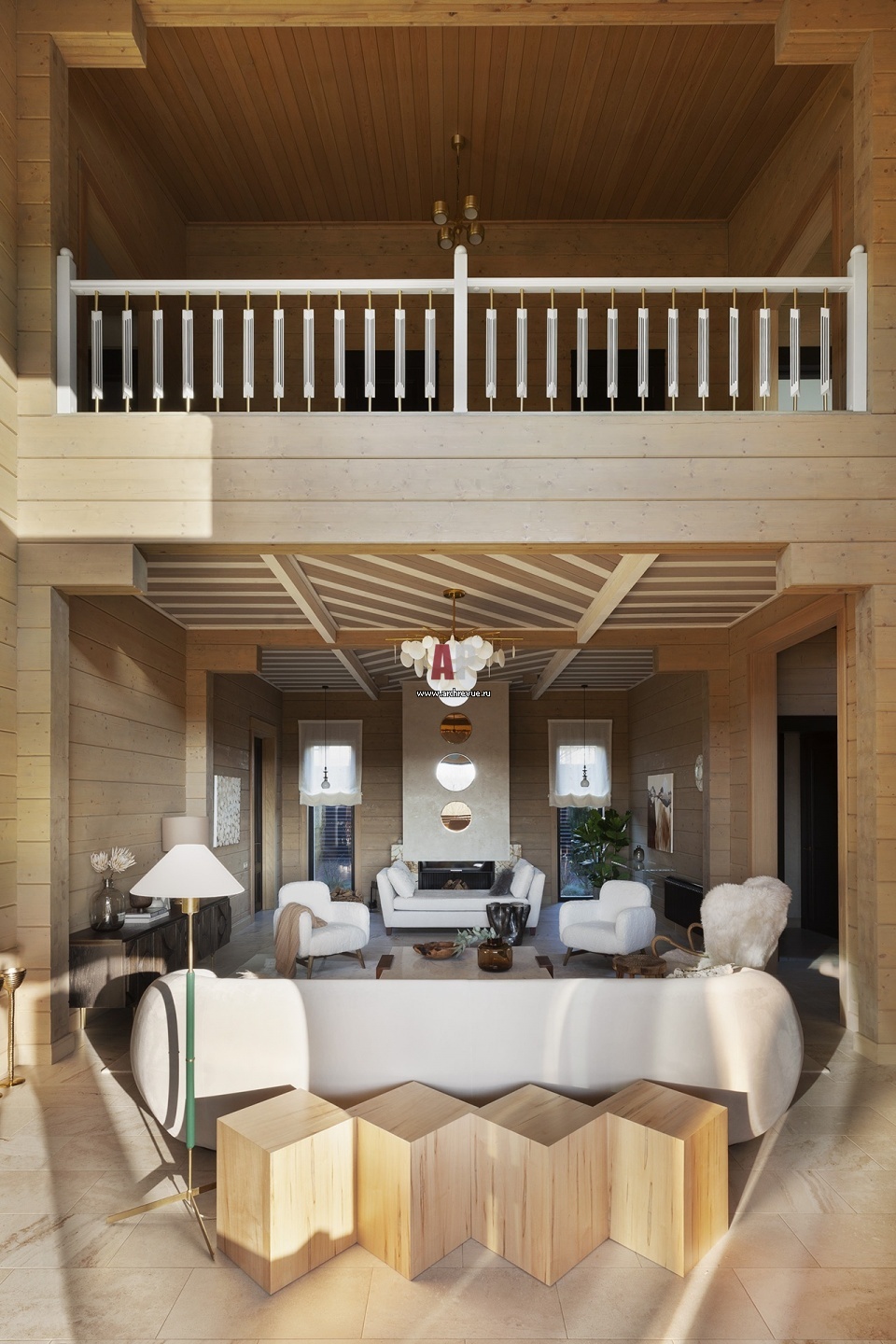 Фото интерьера гостиной деревянного дома в стиле фьюжн