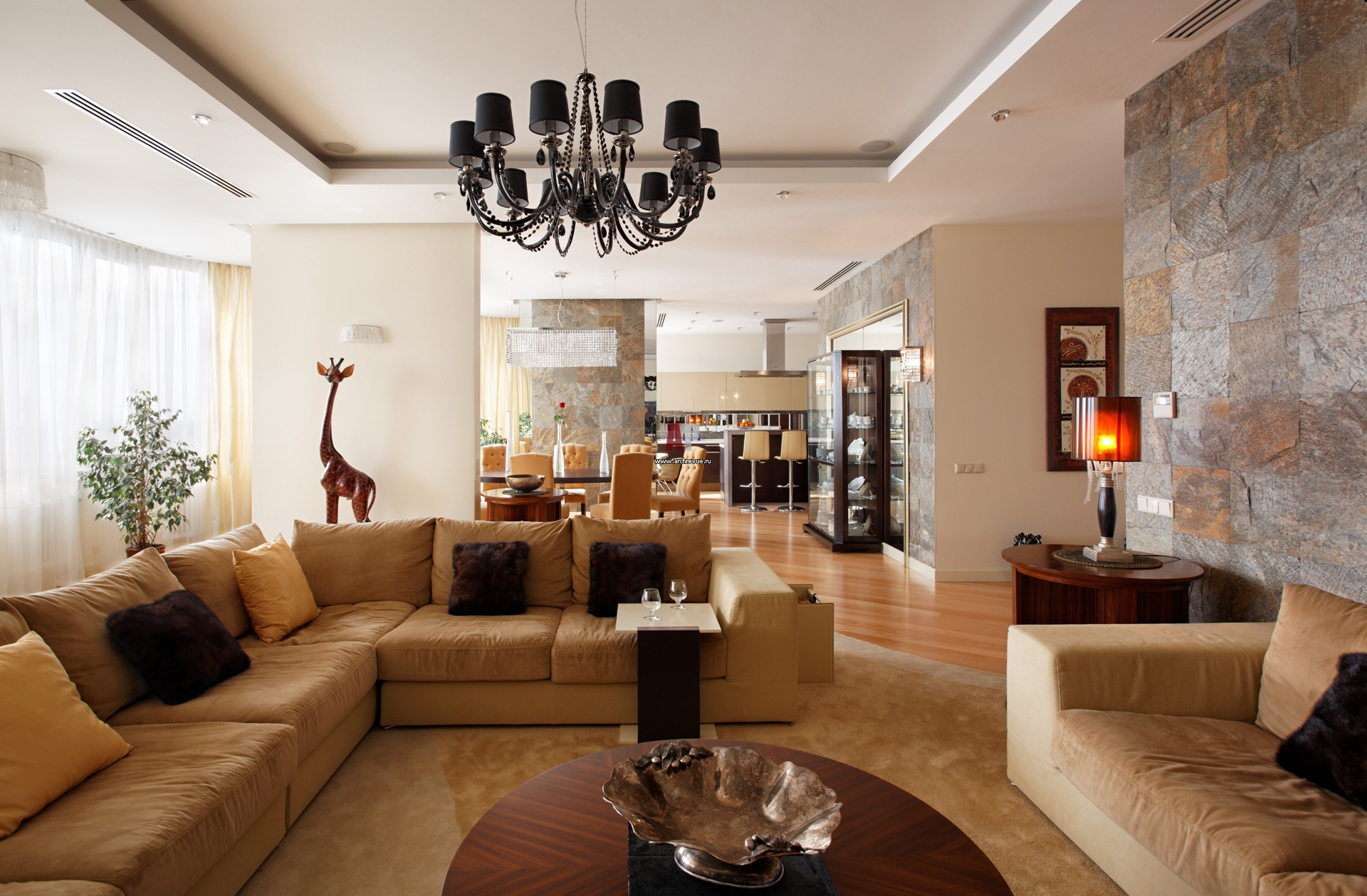 Первый уровень трехэтажного пентхауса занимает просторная гостиная. Она плавно перетекает в каминную, столовую и кухню. Каждая зона обозначена вертикальными перегородками.