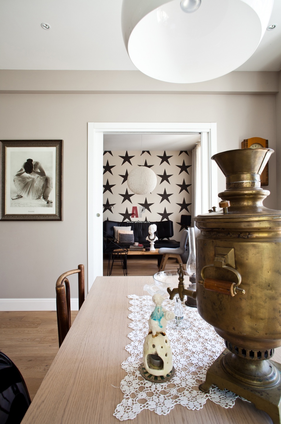 В квартире создана интеллигентная атмосфера, на стыке сталинского ампира и скандинавского дизайна.