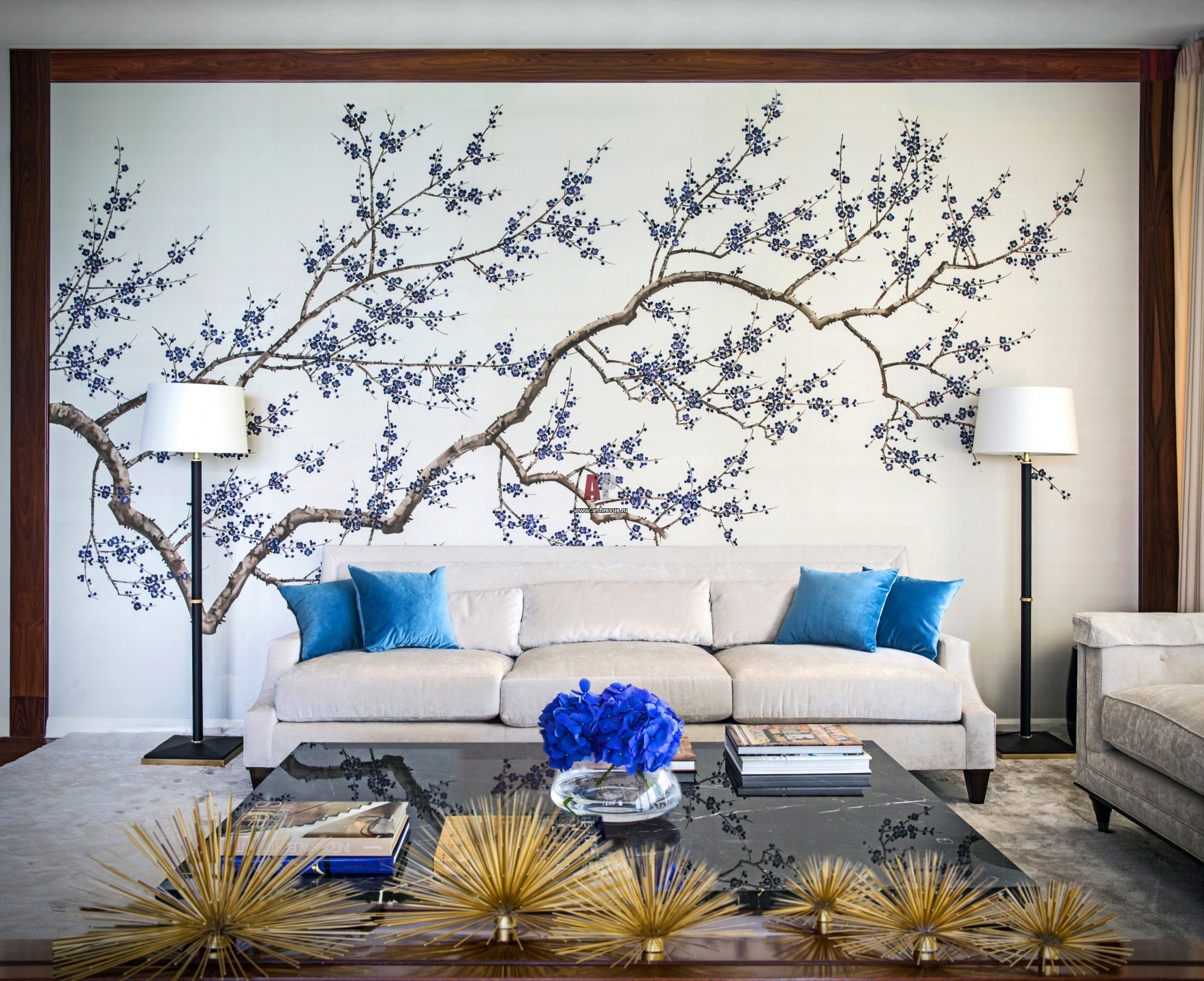 Одна стена в гостиной оформлена панно с изображением цветущей сакуры. Бумажные обои ручной работы, Fromental.