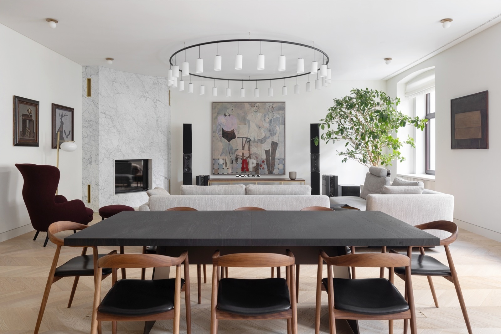 Интерьер намеренно сделан светлым и легким, что позволяет точечно расставить необходимые акценты и подчеркнуть самые значимые элементы интерьера: полукруглый мраморный камин, мраморную кухню, витражные двери в латунном профиле, искусство. Люстра, Santa & Cole.