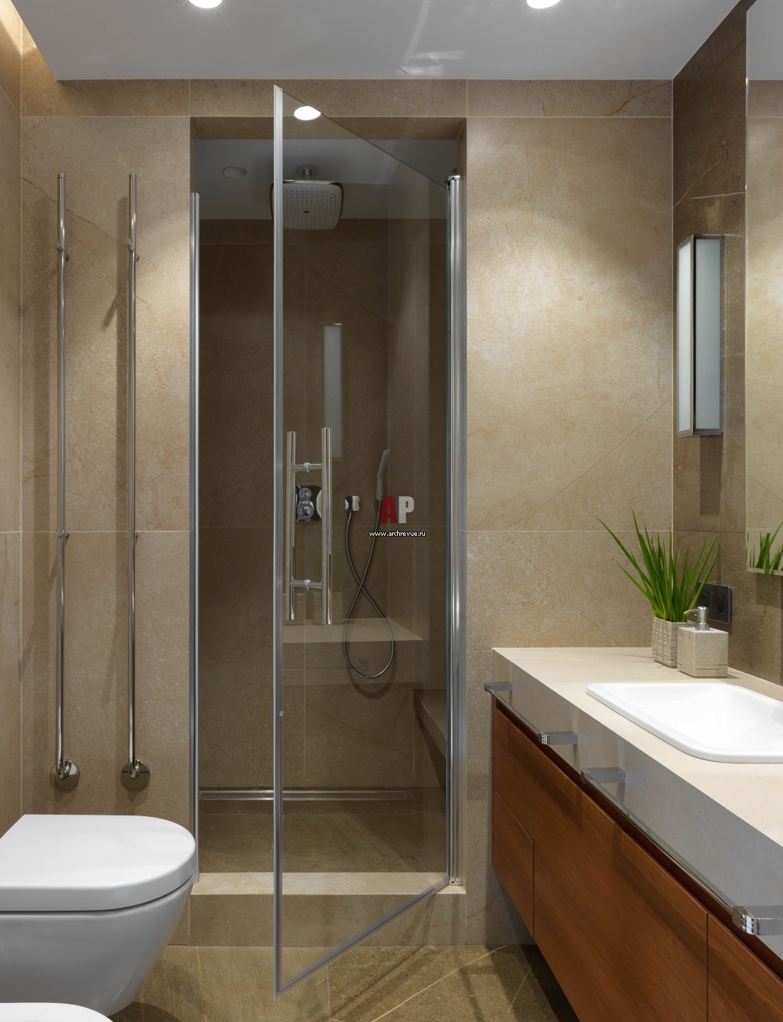 Интерьер хозяйского санузла в мужской квартире. Стены и пол облицованы тонким 5-миллиметровым керамогранитом с фактурой травертина. Санфаянс, Villeroy & Boch. Смесители, Hansgrohe.