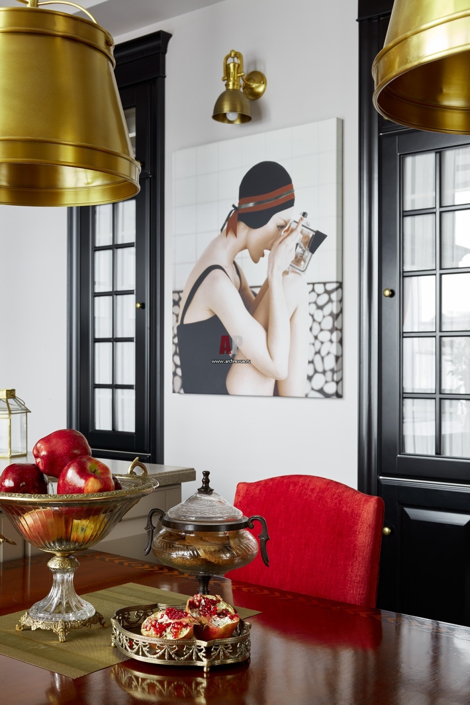 Композиция из симметричных черных шкафов-витрин на кухне – результат удачной маскировки вентиляционных шахт.