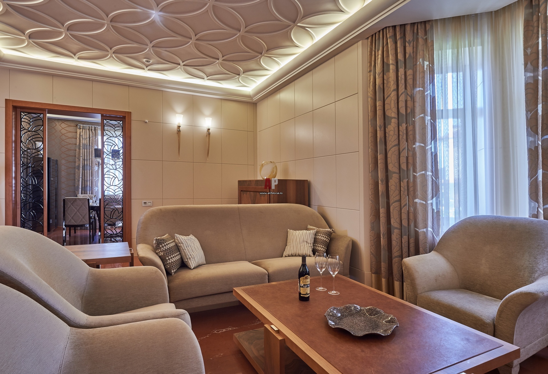 Потолок в мягкой зоне оформлен авторским лепным декором с радиусным орнаментом. Каждый из лепестков был отлит и смонтирован в индивидуальном порядке. Мягкая и корпусная мебель, Smania.