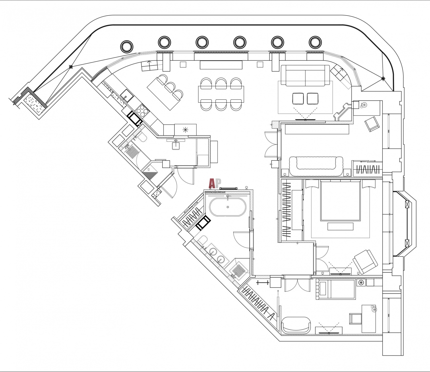 Планировка 4-х комнатной угловой квартиры с видом на исторический центр города.
