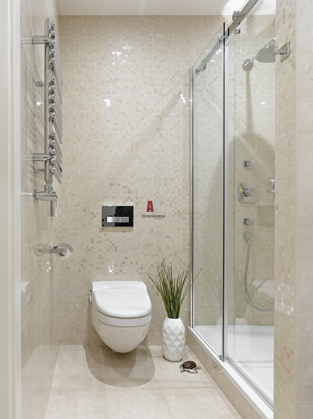 На фото – интерьер ванной комнаты душевой кабиной. Дверца душевой кабины, HSK. Душевой поддон, Villeroy & Boch. Унитаз, Geberit. Смесители, Hansgrohe, Remer Rubinetterie.