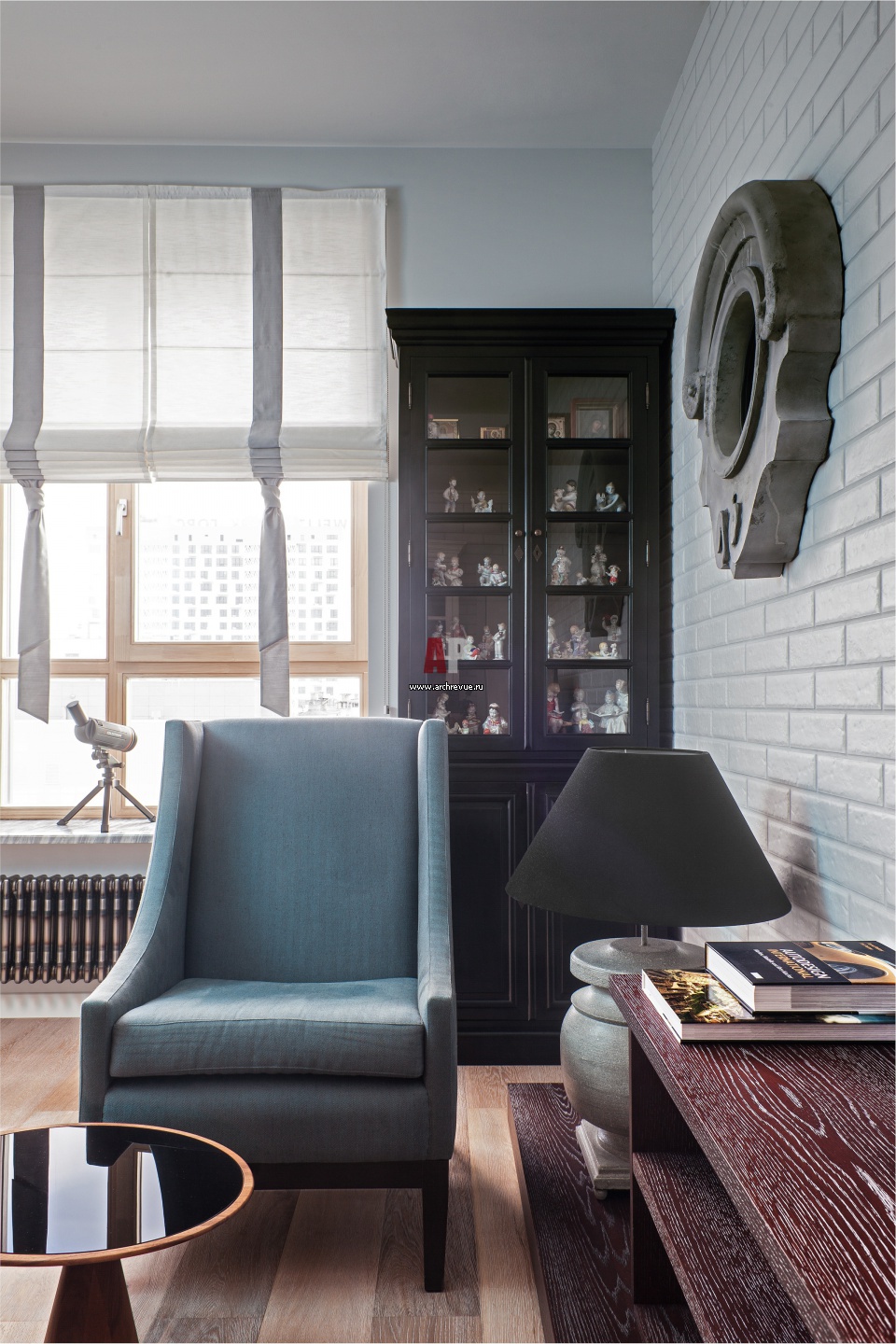 Стены гостиной оформлены керамическим гранитом под «белый кирпич», Rex (серия Metrowall). Радиаторы отопления, Zender.