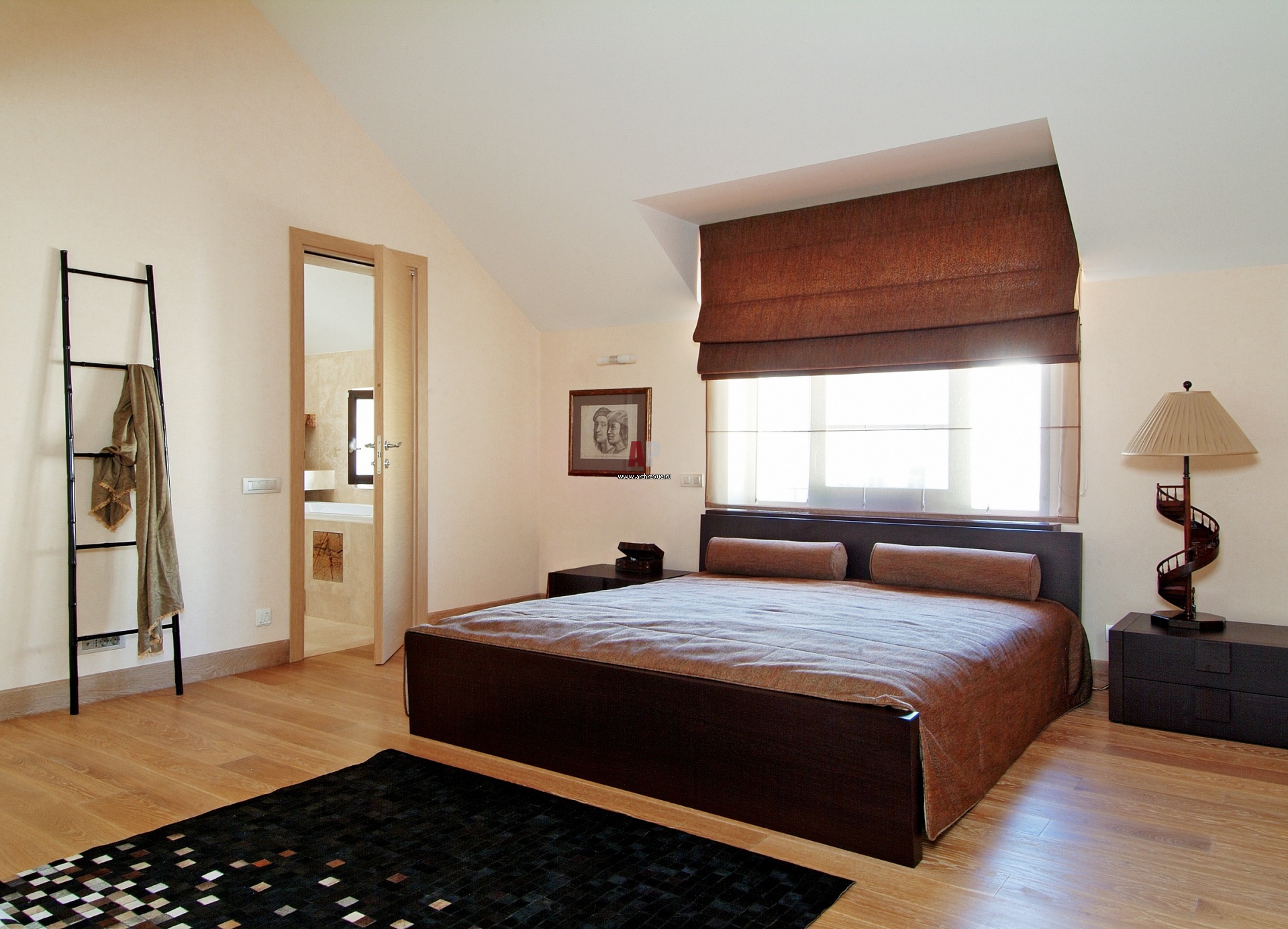 Фото интерьера спальни в стиле минимализм. Из спальни сделан выход в ванную комнату.