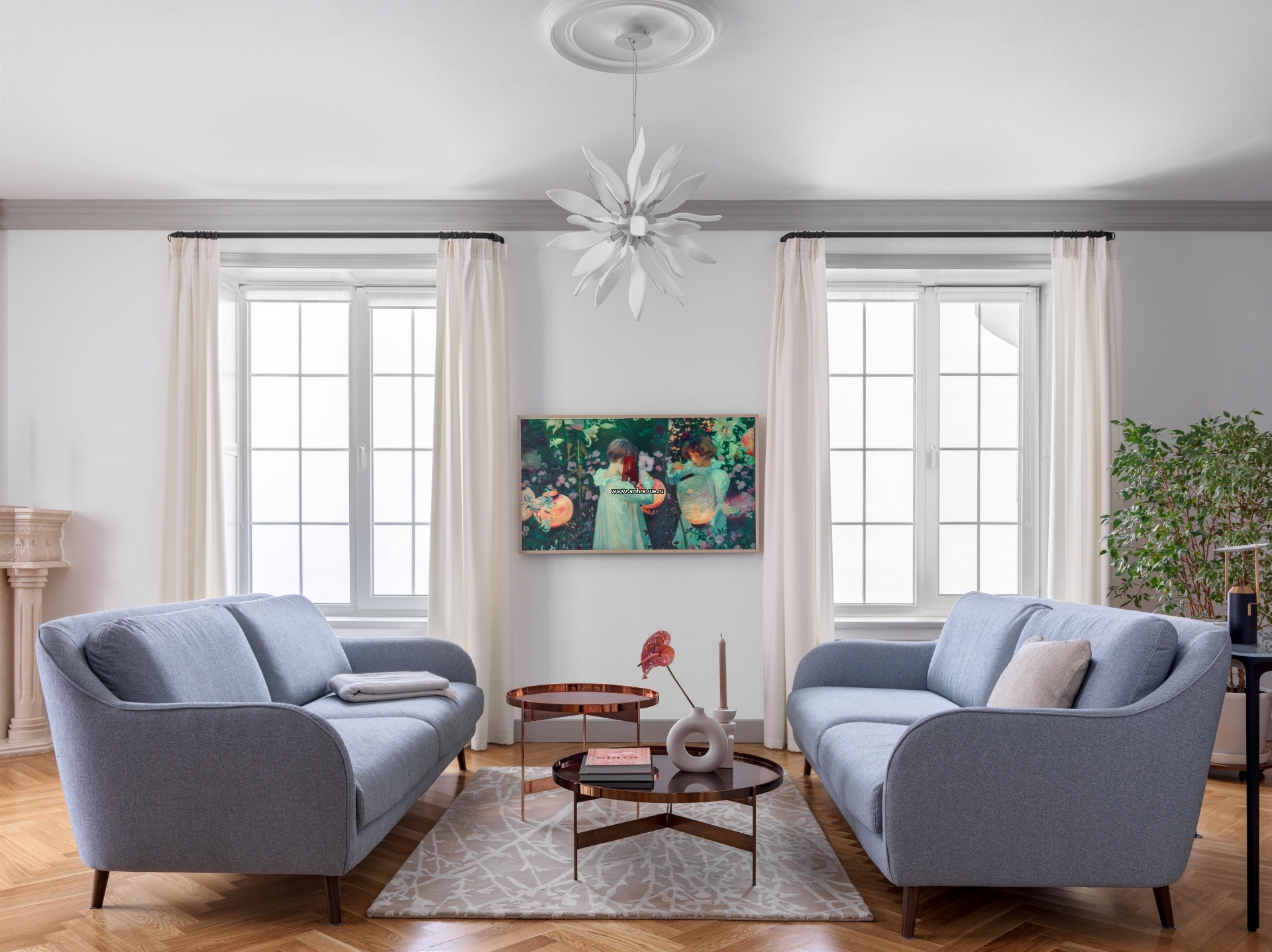 Центральное место в гостиной занимает диванная группа. Диваны, Sits. Журнальные столики, Pianca. Потолочный светильник, Ideal Lux. Репродукция Джона Сингера Сарджента маскирует телевизор, Samsung The Frame.