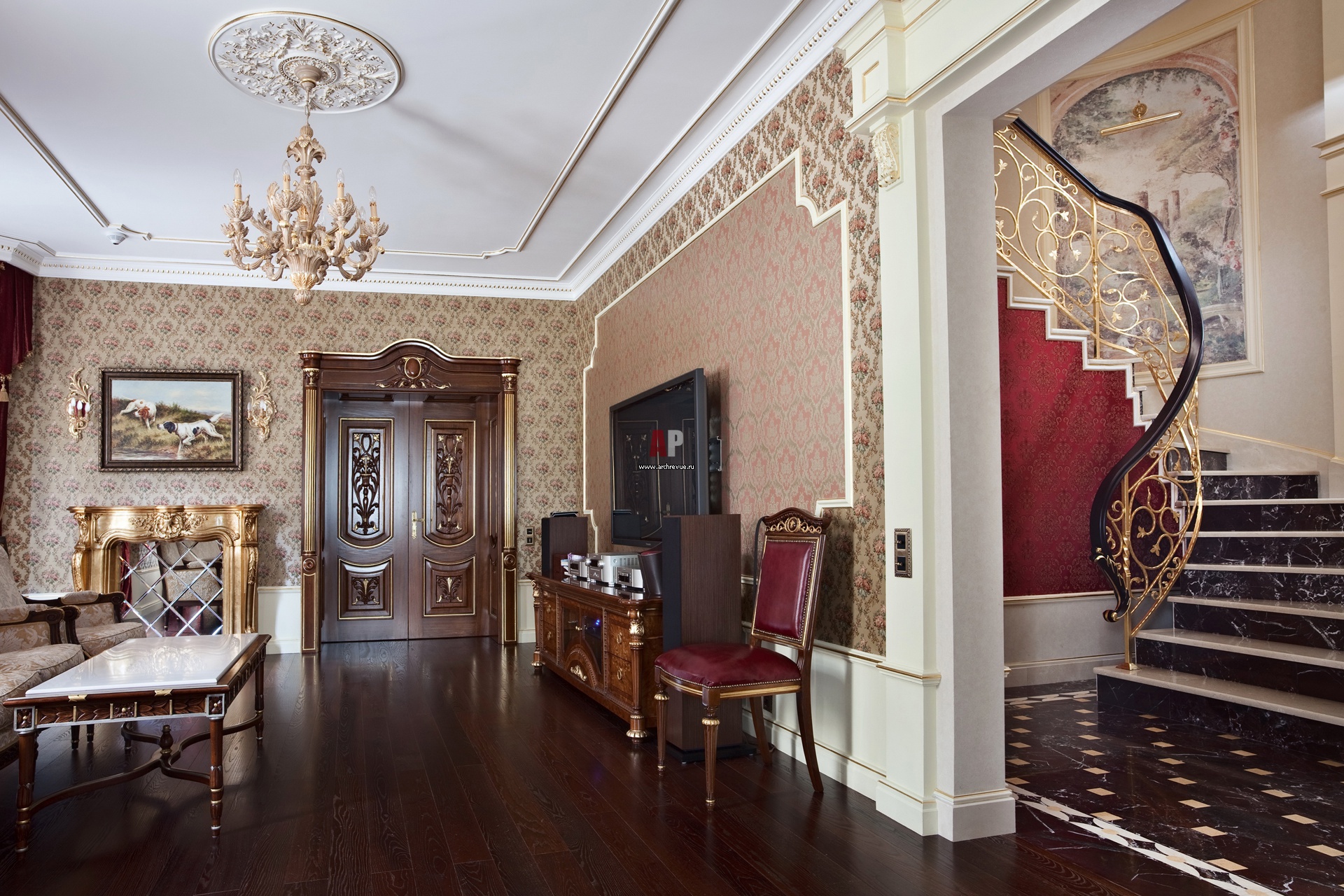 Дизайн интерьера гостиной в стиле неоклассика. Стены украшены двумя видами текстильных обоев с цветами, поставщик «Ампир Декор». Распашная двустворчатая дверь в дворцовом стиле выполнена из древесины ореха, украшена резьбой и золотом. На стенах – картины с охотничьими сценами.