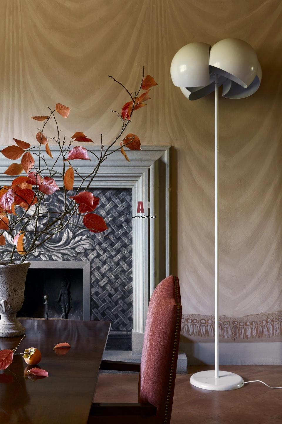 Фрагмент столовой в теплой терракотовой палитре. Роспись на стене имитирует театральный занавес.