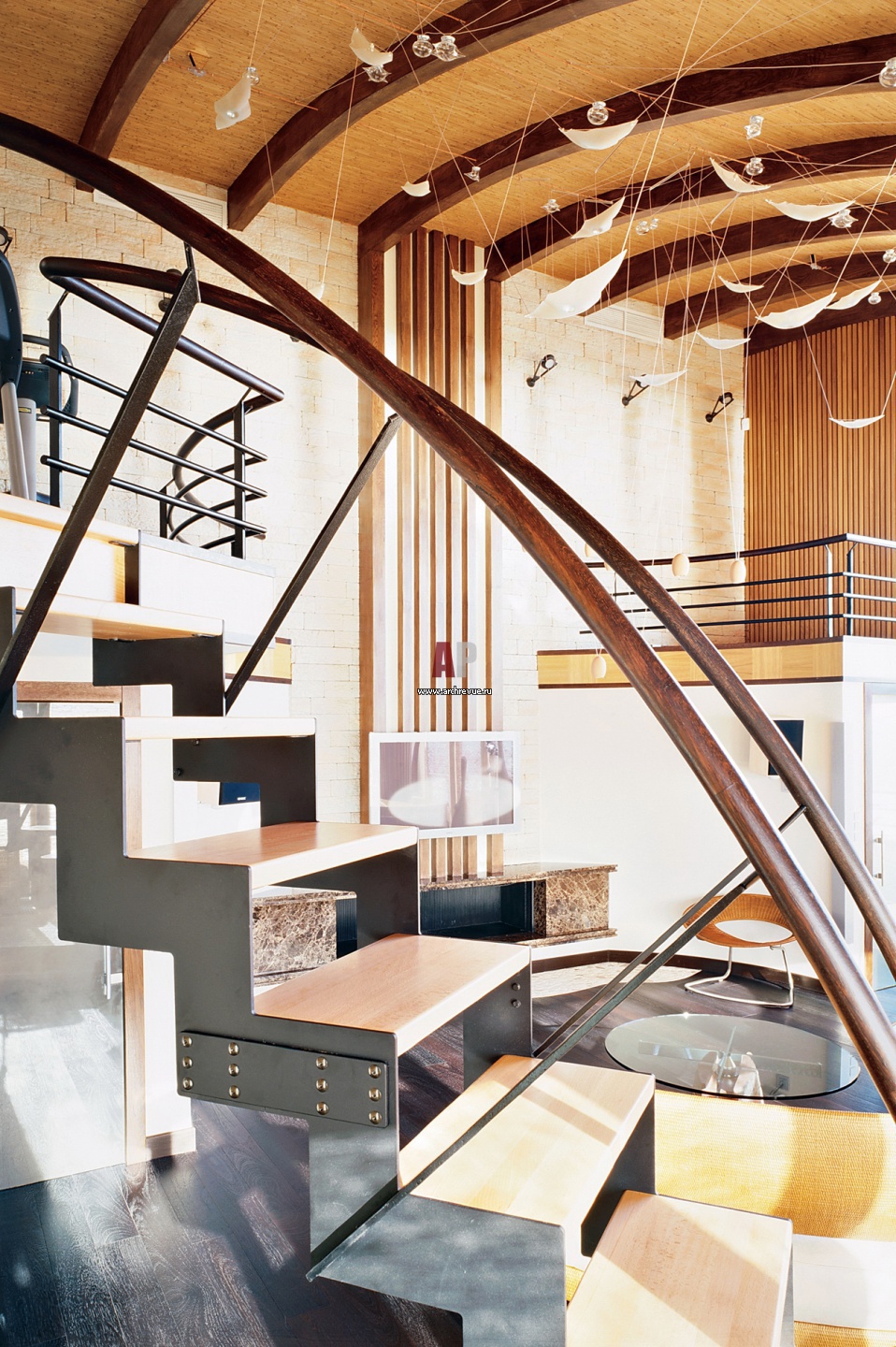 Фрагмент лестницы, ведущей из зоны отдыха третьего этажа на небольшую антресоль. Здесь разместился тренажерный комплекс и сауна с гидромассажем. Лестница, изготовление «Савэкс».