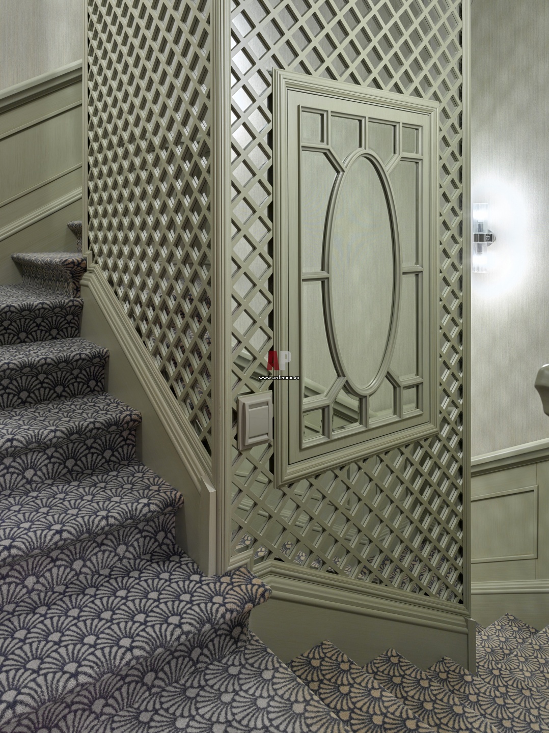 Открытый пролет лестницы декорирован панелями, они имитируют шахту лифта. Деревянные панели с диагональной разбивкой декорированы зеркальной пленкой. На ступенях – ковровое покрытие со стилизованным цветочным рисунком.