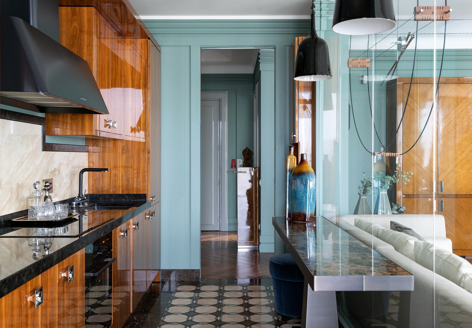 На кухню и в столовую можно попасть, минуя гостиную, и не тревожа гостей и отдыхающих хозяев. Кухонный гарнитур с лакированными фасадами, Aster Cucine. Консоль, Longhi.