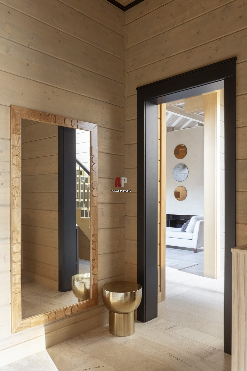 Семейный дом из бруса с теплой палитрой. Интерьер прихожей. Рама зеркала оформлена простым геометрическим орнаментом.