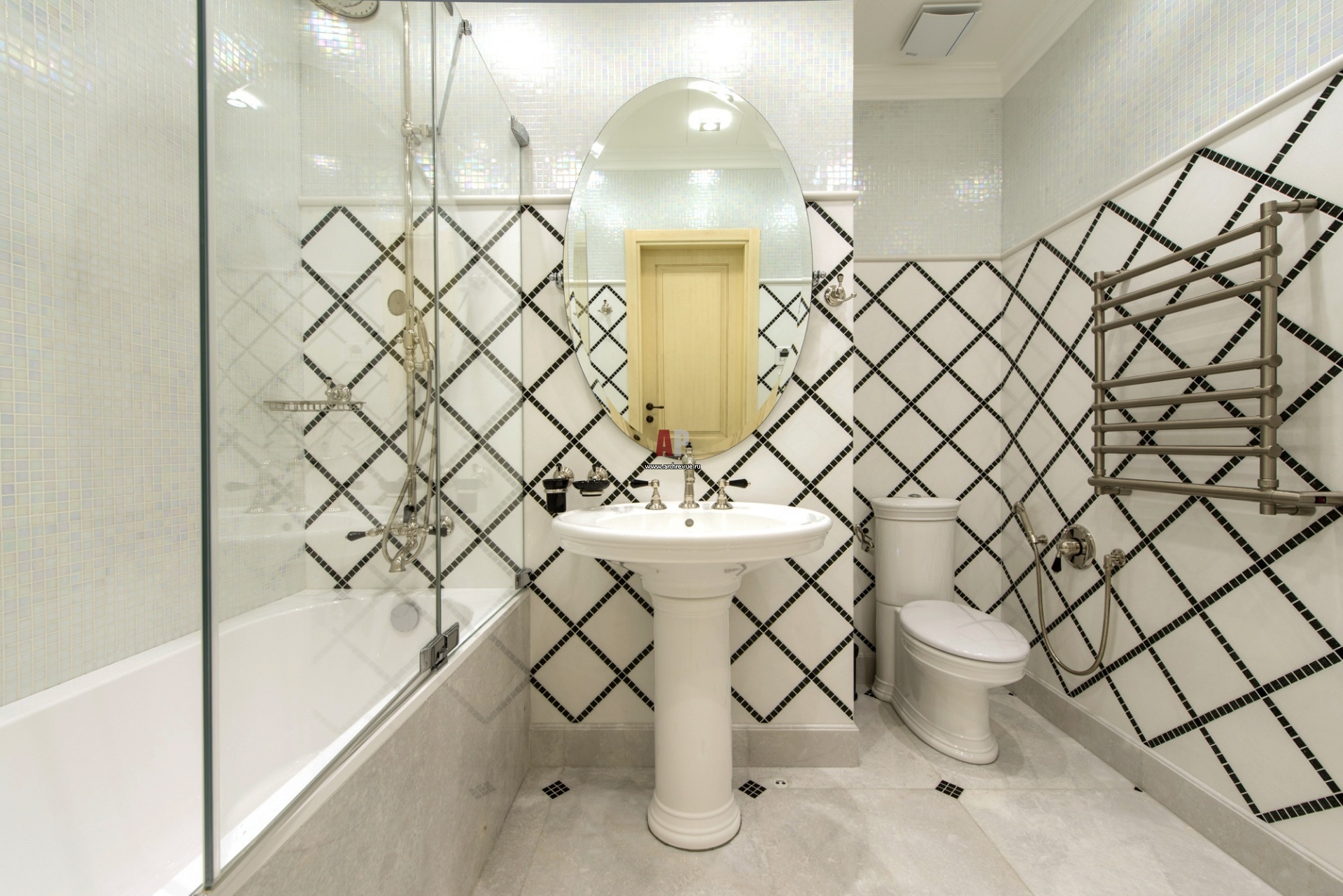 Белая ванная с черными ромбами. Сантехника, Villeroy & Boch.