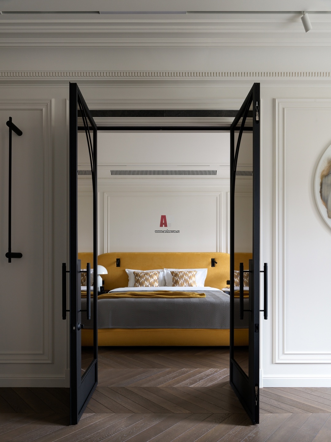 Из гостиной организован выход в мастер-спальню. Двери изготовлены из тонированного стекла и контрастируют с белыми стенами.