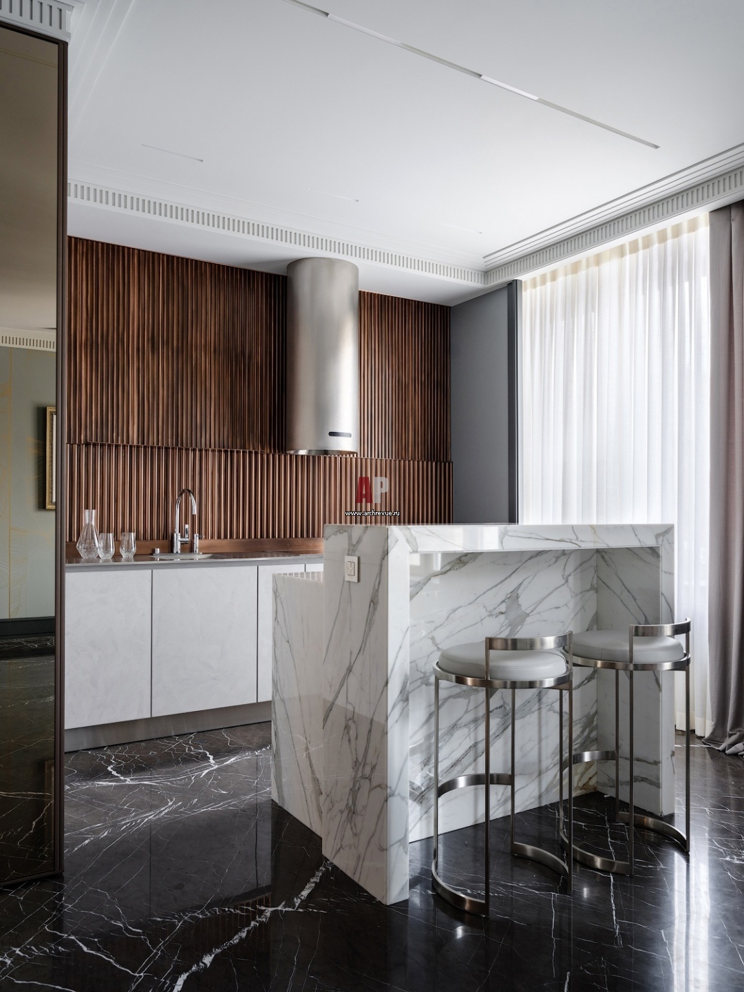 Кухня включена в общее пространство, рабочая зона размещена за мраморным островом и не перетягивает на себя внимание. Кухня, Eggersmann.