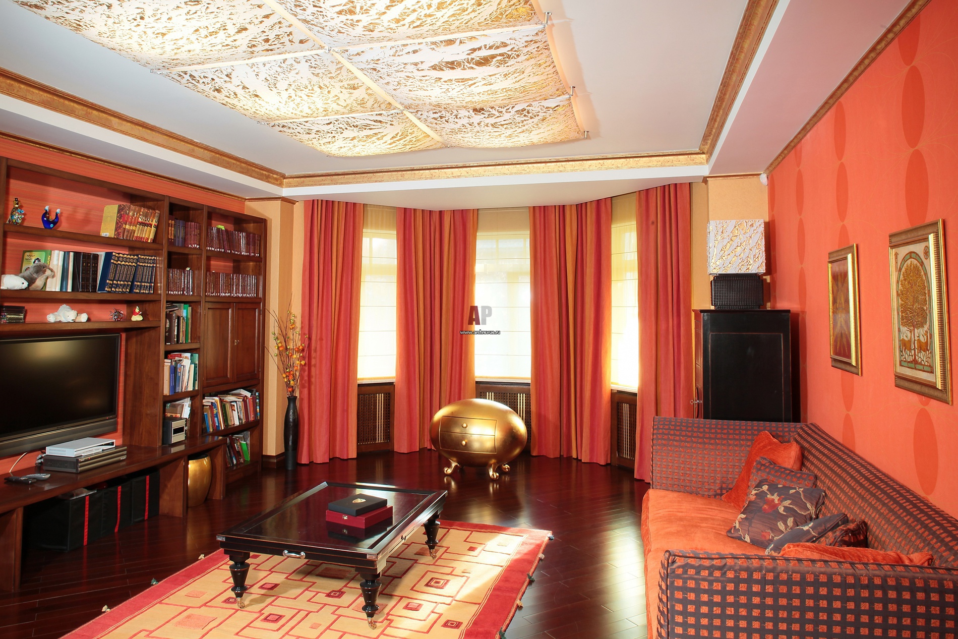 Детская игровая комната решена в активном красно-оранжевом цвете.