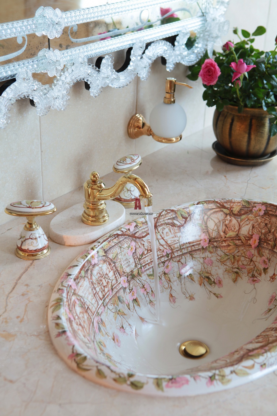 Фарфоровая мойка Kohler украшена росписью с растительным орнаментом.