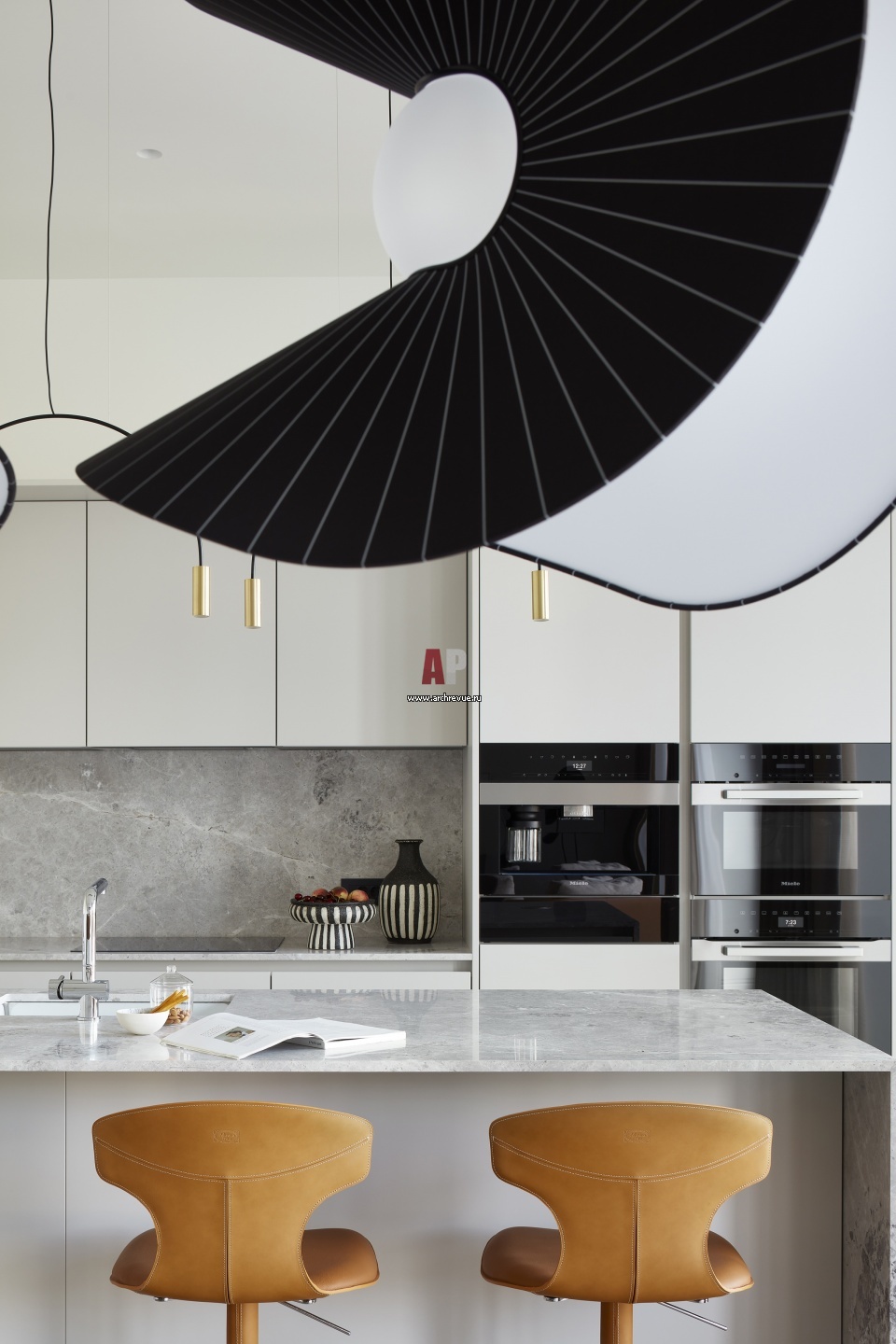 Мужская квартира в ЖК «Бродский». Интерьер кухни. Кожаные барные стулья, Poltrona Frau, модель Montera.