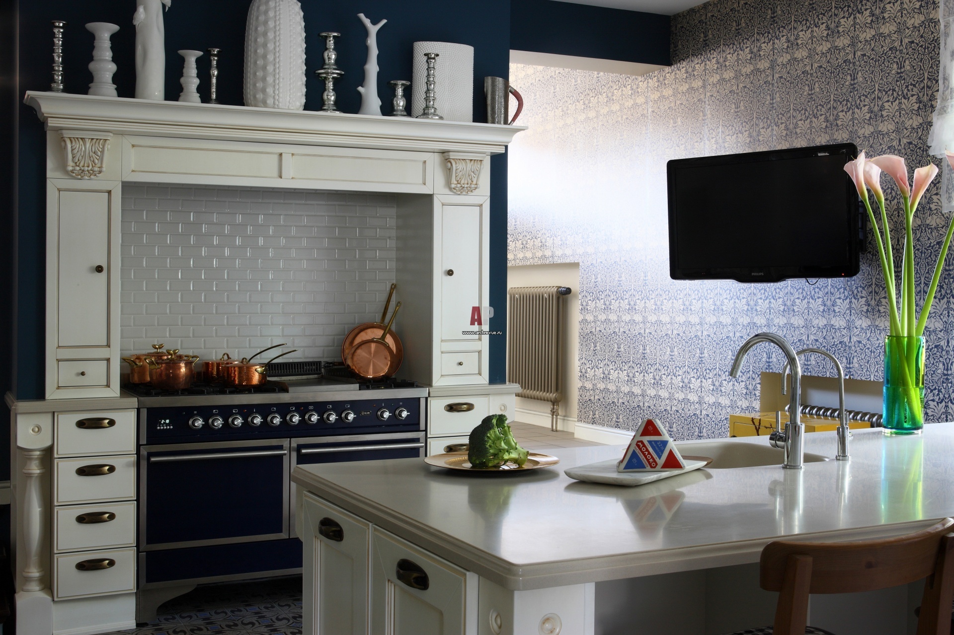 Встроенный в нишу очаг разделяет кухню на две зоны – парадную и рабочую. На рабочей половине находится техническая часть с холодильником, мойкой и рабочими поверхностями. По другую сторону расположен остров, который служит местом для семейных завтраков.