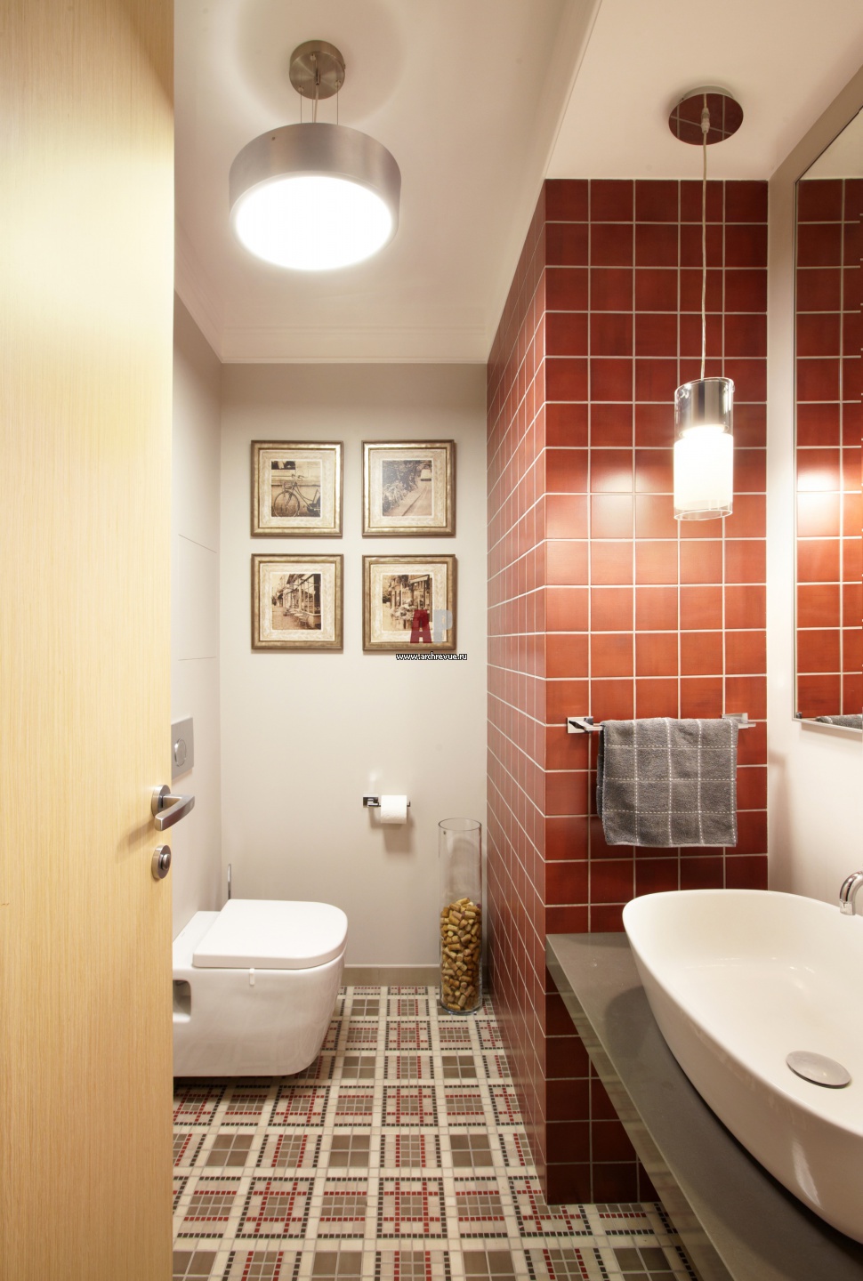 Интерьер гостевого санузла с красной стеной. На полу – плитка, Agrob Buchtal. Унитаз и раковина, Antonio Lupi.