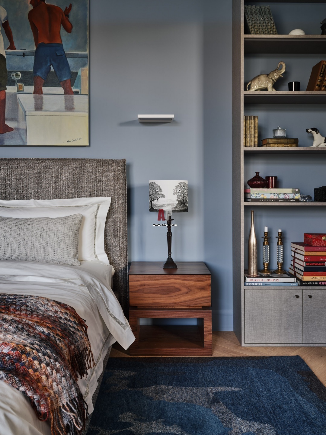 Спальня. Стеллаж изготовлен на заказ из итальянской мебельной плиты Cleaf. Прикроватные тумбы, Odingeniy. Авторские светильники на тумбах Екатерина Уткина. В стеллаже – фарфоровые фигуры «ЛФЗ 1950-х гг. и каслинское литье, оставшиеся от прежних хозяев.