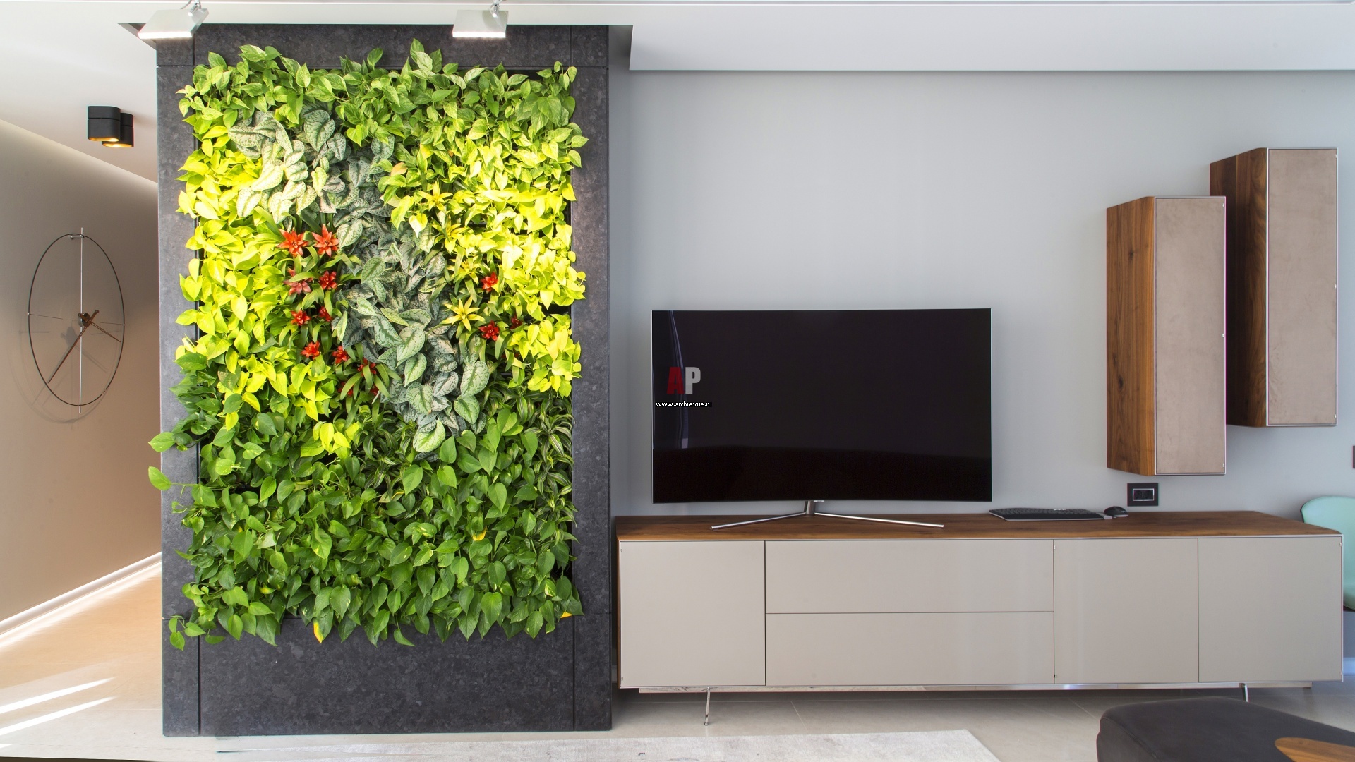 Портал из темно-серого камня служит обрамлением для вертикального озеленения. Зеленая стена с встроенной системой полива оживляет минималистский по духу интерьер в высотке.