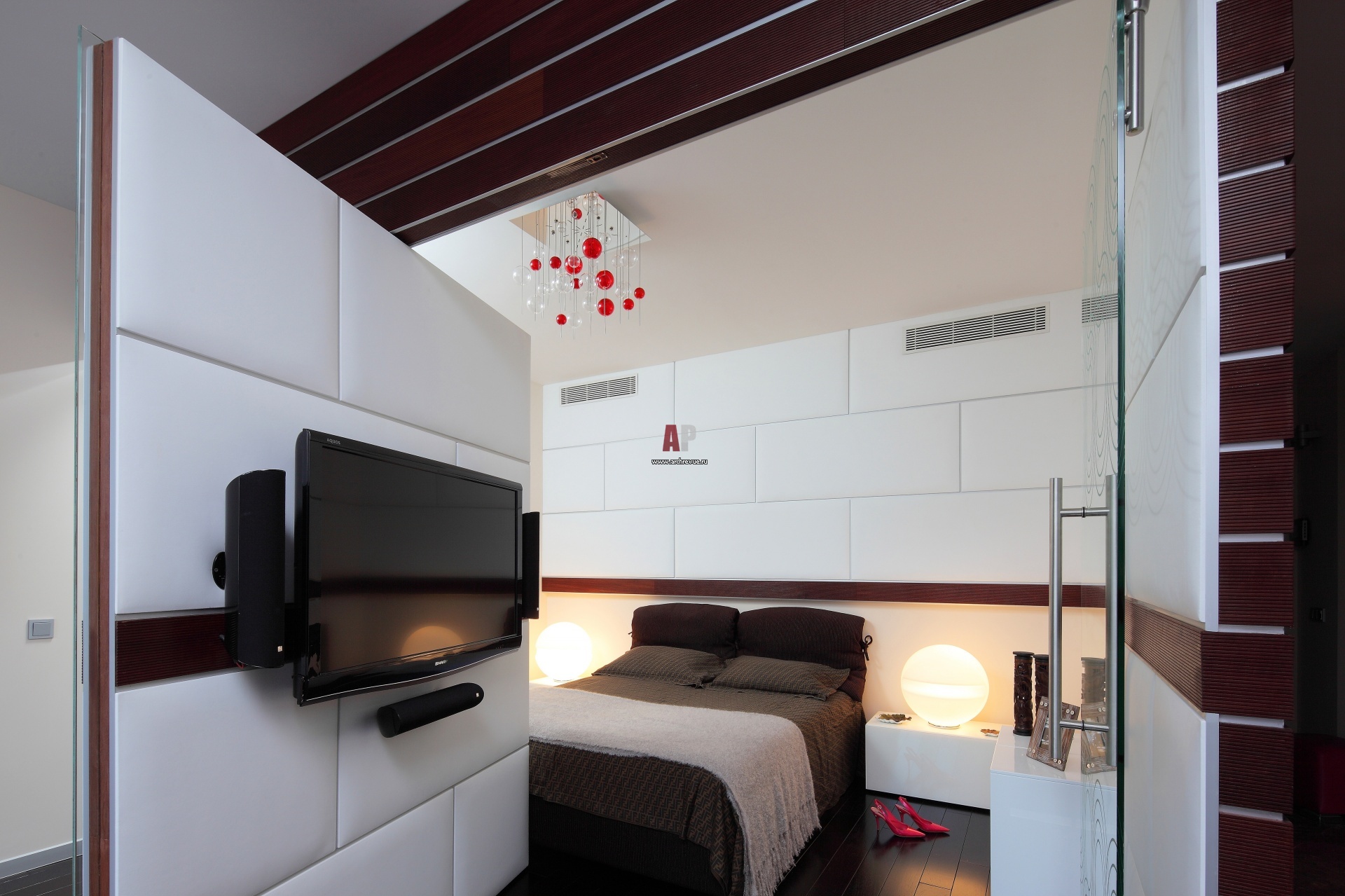 От гостиной спальная зона отделена стеклянными перегородками с центральным поворотным модулем, на котором размещен экран ТВ. Центральная секция поворачивается на 90 градусов, тем самым экран ТВ работает на спальню и гостиную.