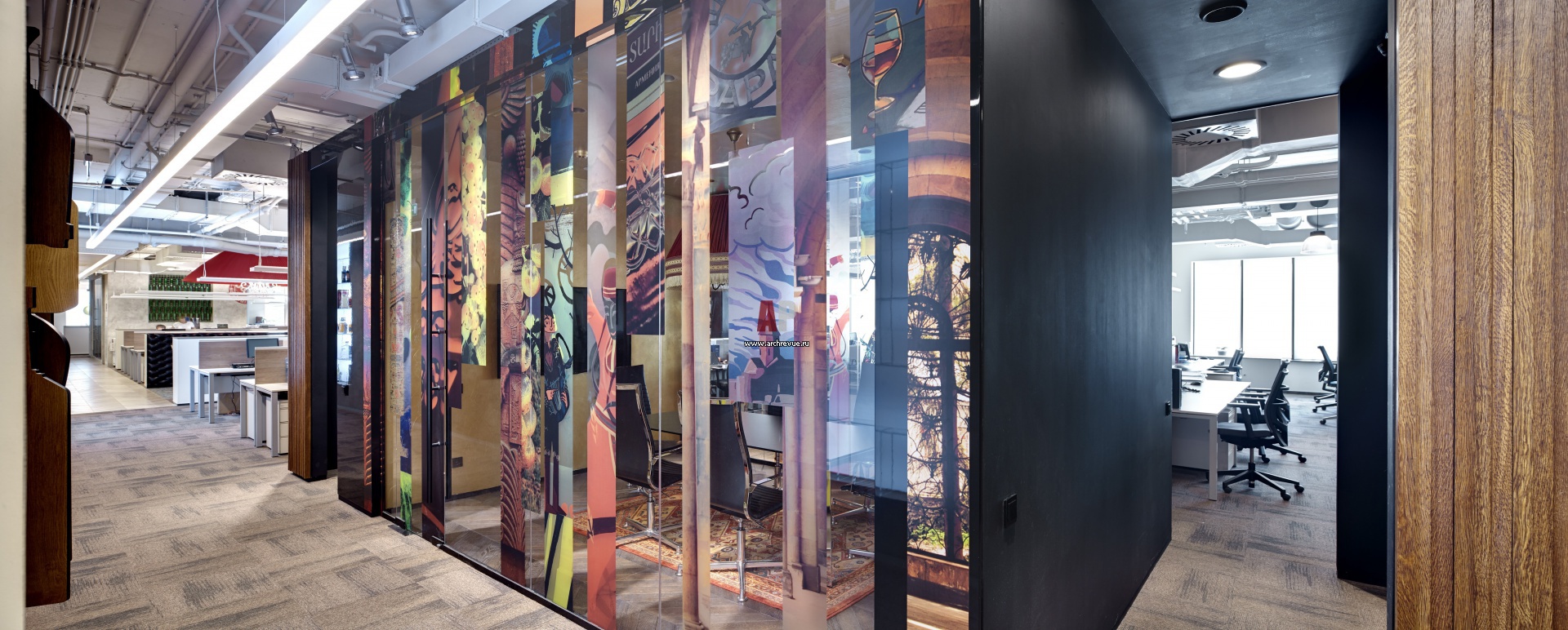 Стена, отделяющая «восточную» переговорную, оформлена в стиле русского авангарда начала ХХ века. Принт нанесен на вертикальные стеклянные панели.