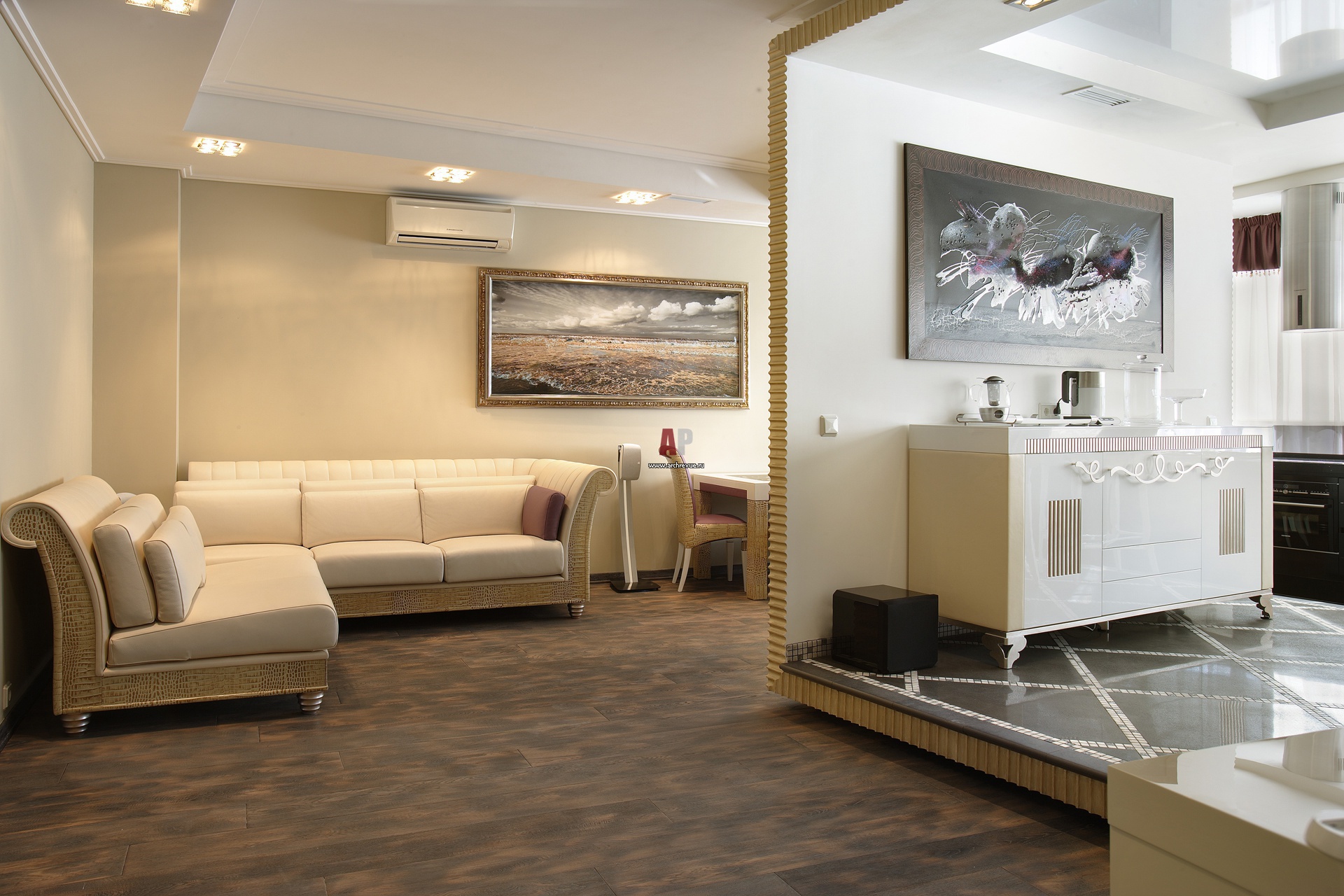 Мягкая зона в гостиной. Стены выкрашены в золотисто-бежевый, нейтральный оттенок красочными составами Benjamin Moore.