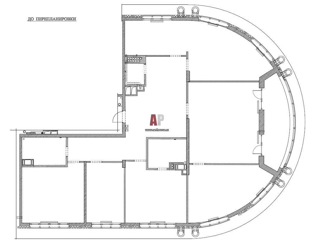 План большой семейной квартиры площадью 220 кв. м с панорамным радиусным фасадом до реконструкции.