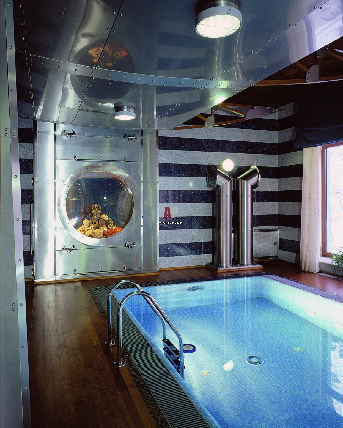 Бассейн расположен на первом уровне дома, в правом крыле. Потолок оформлен панелями из нержавеющей стали, изготовление State-art, в духе старой подводной лодки. Из них же выполнен корпус аквариума.