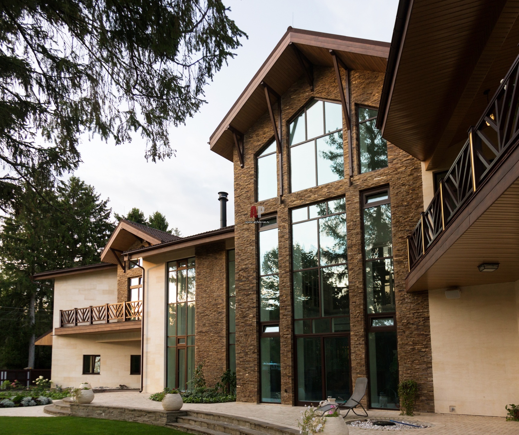 Фасад с центральным стеклянным объемом, где разместилась двусветная гостиная и зимний сад.
