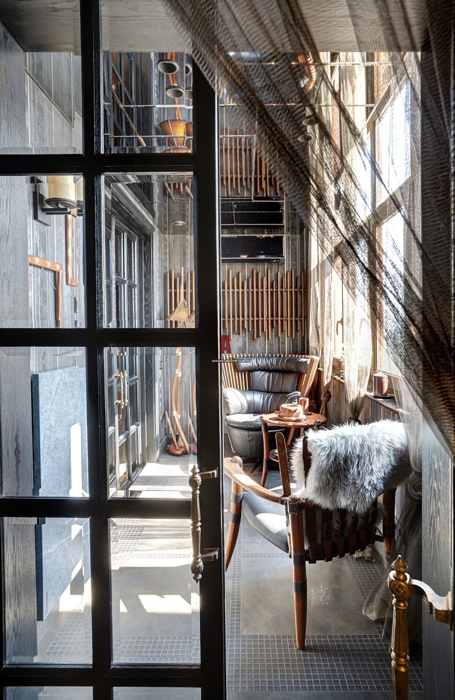 На застекленный балкон можно попасть из гостиной и из спальни. В помещении установлено два комплекта филенчатых дверей из венге с прозрачными витражами. Латунные дверные ручки изготовлены по эскизам автора проекта.