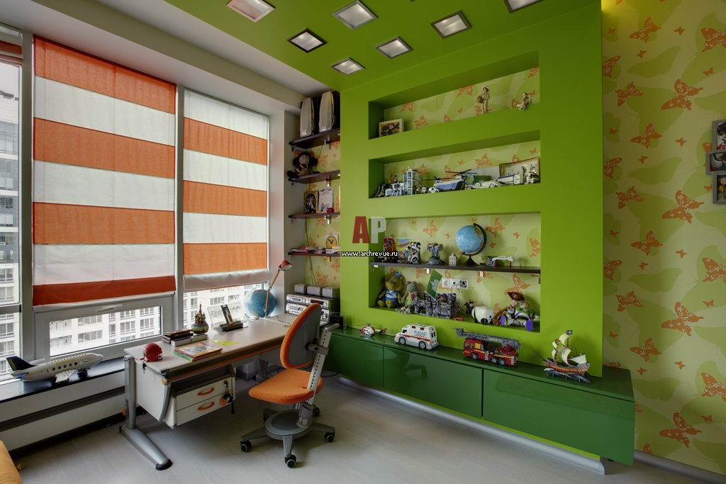 Дизайн детской комнаты в яркой цветовой гамме. Стеллаж с полками и ячеистая потолочная конструкция выкрашены в ярко-зеленый цвет. Квадратные встроенные потолочные светильники хорошо освещают помещение, поставщик «Неон Проект». Римские шторы в бело-оранжевую полоску.