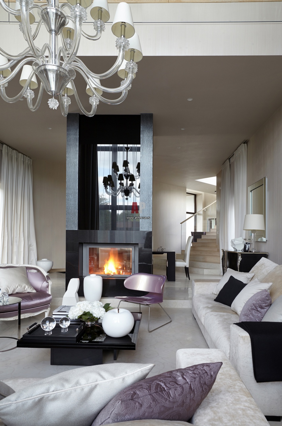 В открытом пространстве первого этажа черный портал камина зонирует гостиную. Разные по назначению зоны выделены с помощью системы подиумов и ступеней. Лаконичный портал камина облицован черным мрамором.