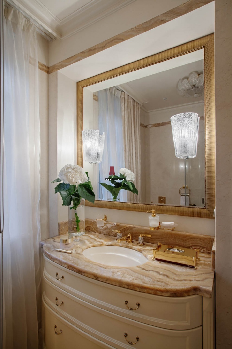 Столешница умывальника в интерьере гостевого санузла сделана из оникса теплого медового цвета.