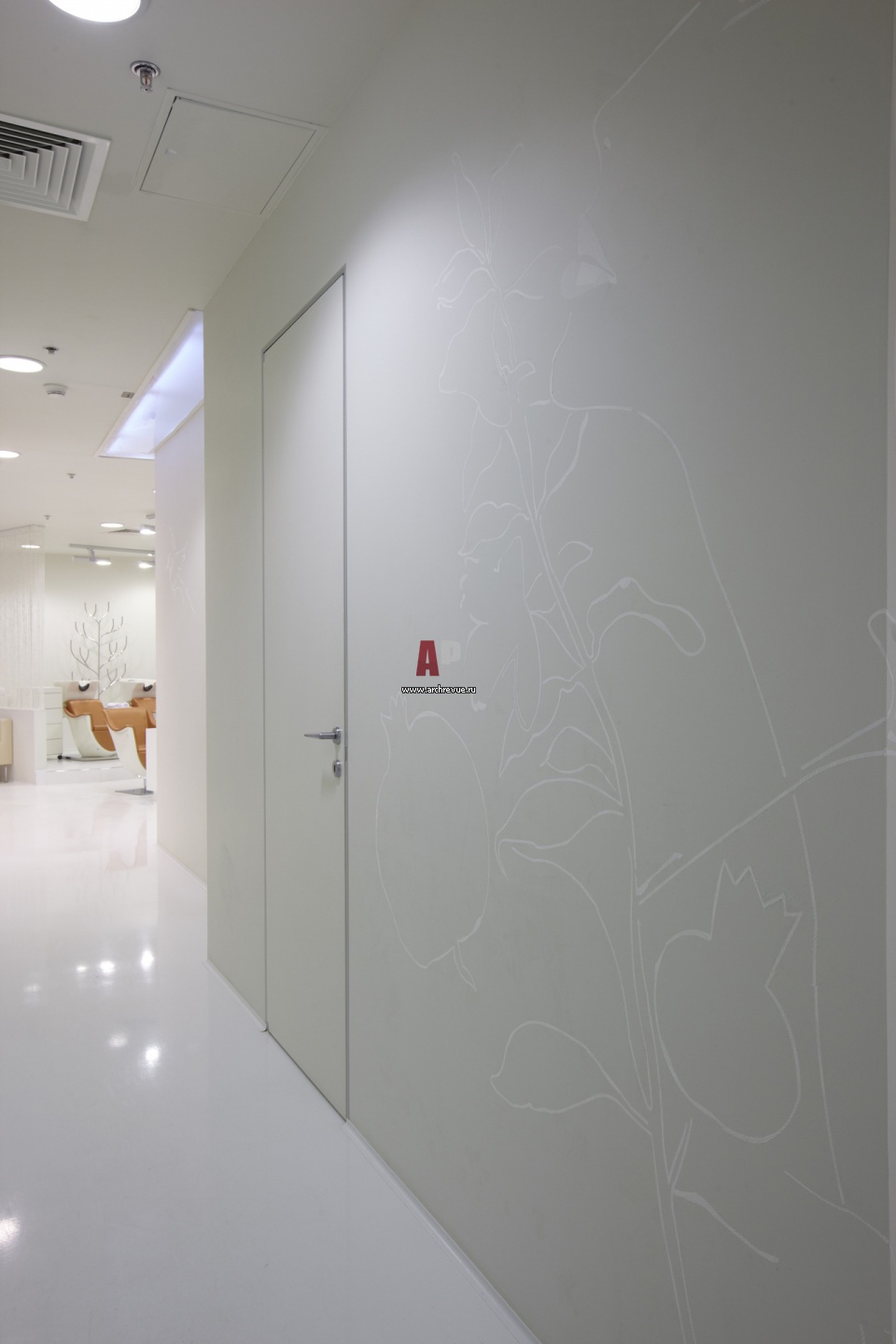 Фото интерьера салона красоты. Поверхность белых наливных полов имеет красивый глянец.