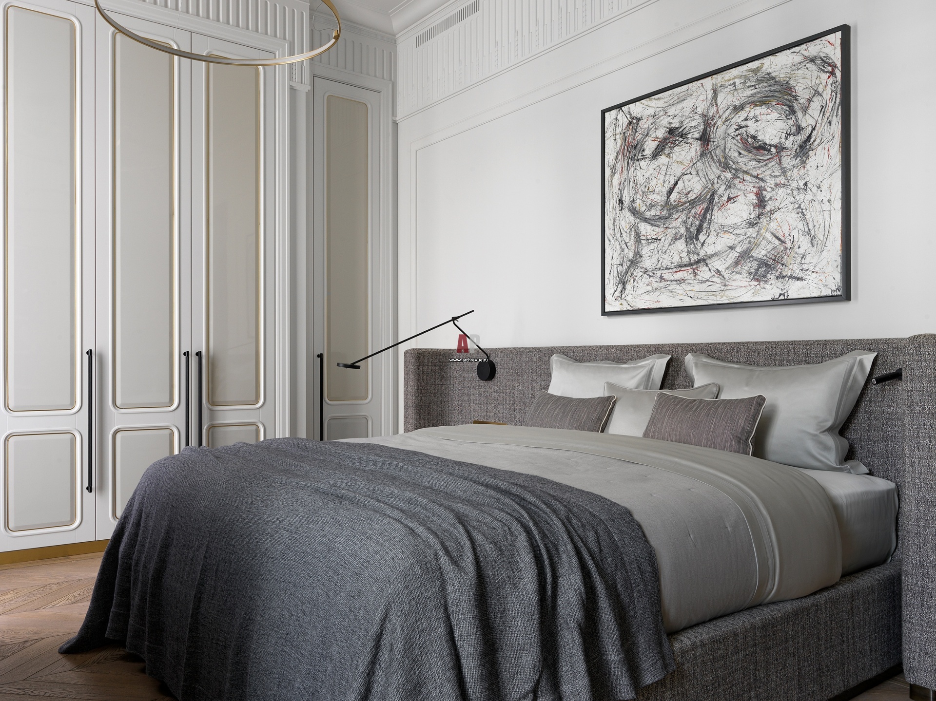 Белая спальня хозяина. Кровать, прикроватная тумба, на заказ, по эскизам дизайнеров. Картина работы Гриши Климова.