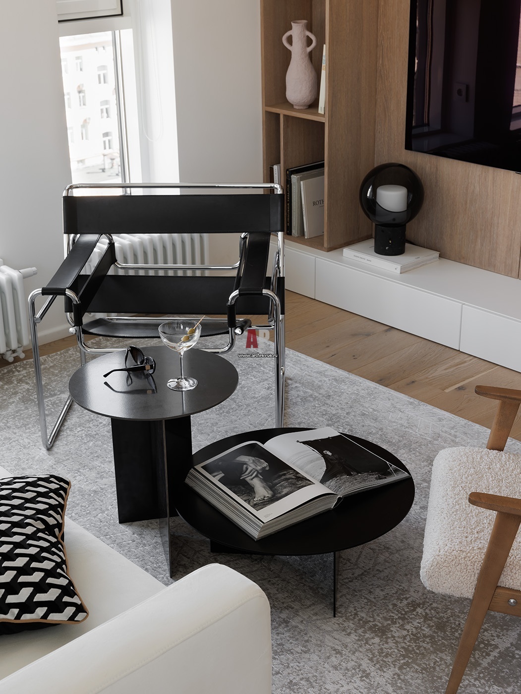 Белая квартира в духе скандинавского минимализма. Интерьер гостиной.