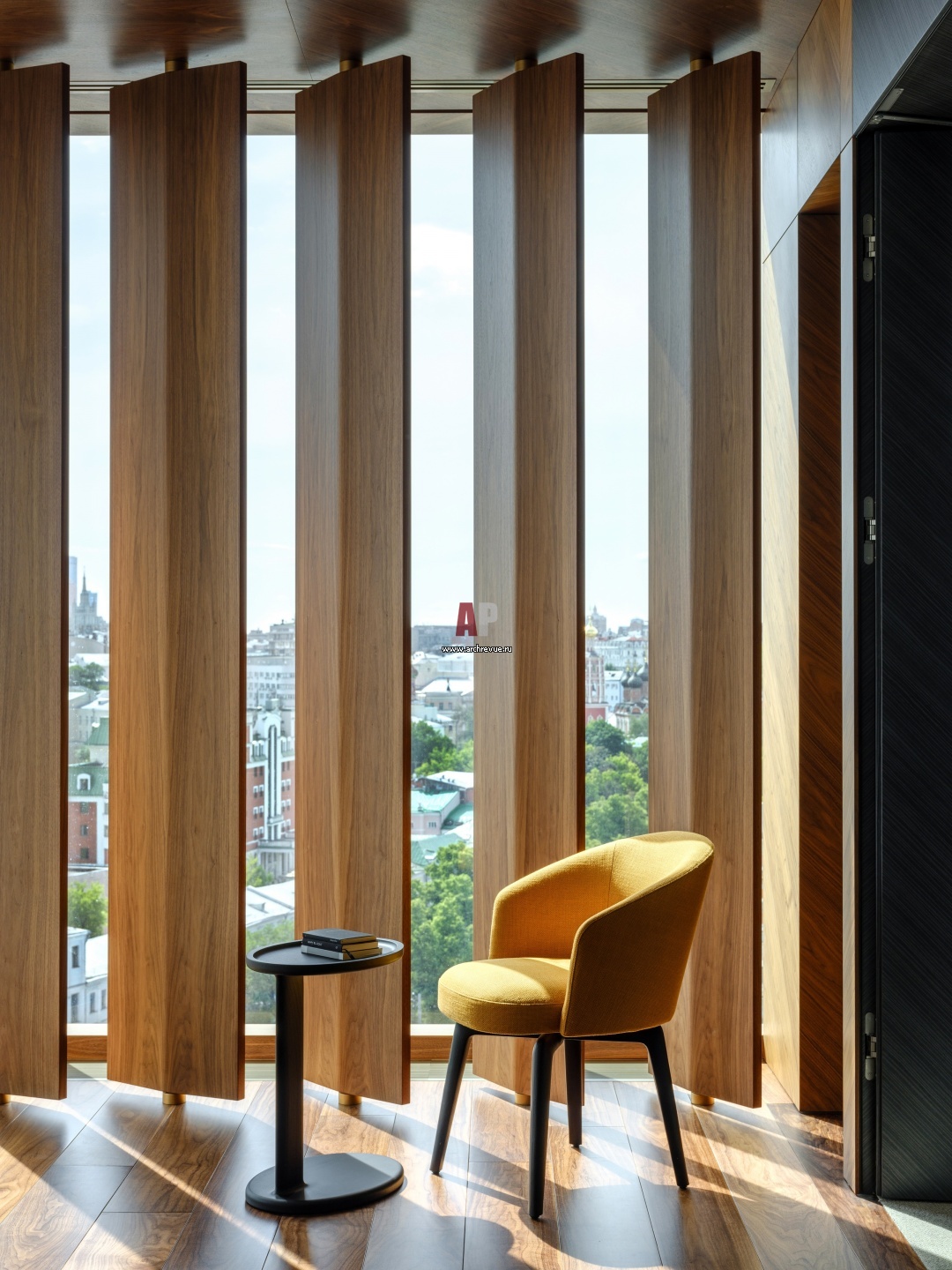 Панорамная квартира на Цветном бульваре. Журнальный столик, Flexform. Стул, Minotti. Окна оформлены с использованием защитной наружной пленки, рулонных штор из полупрозрачного материала и поворотных деревянных лемелей.