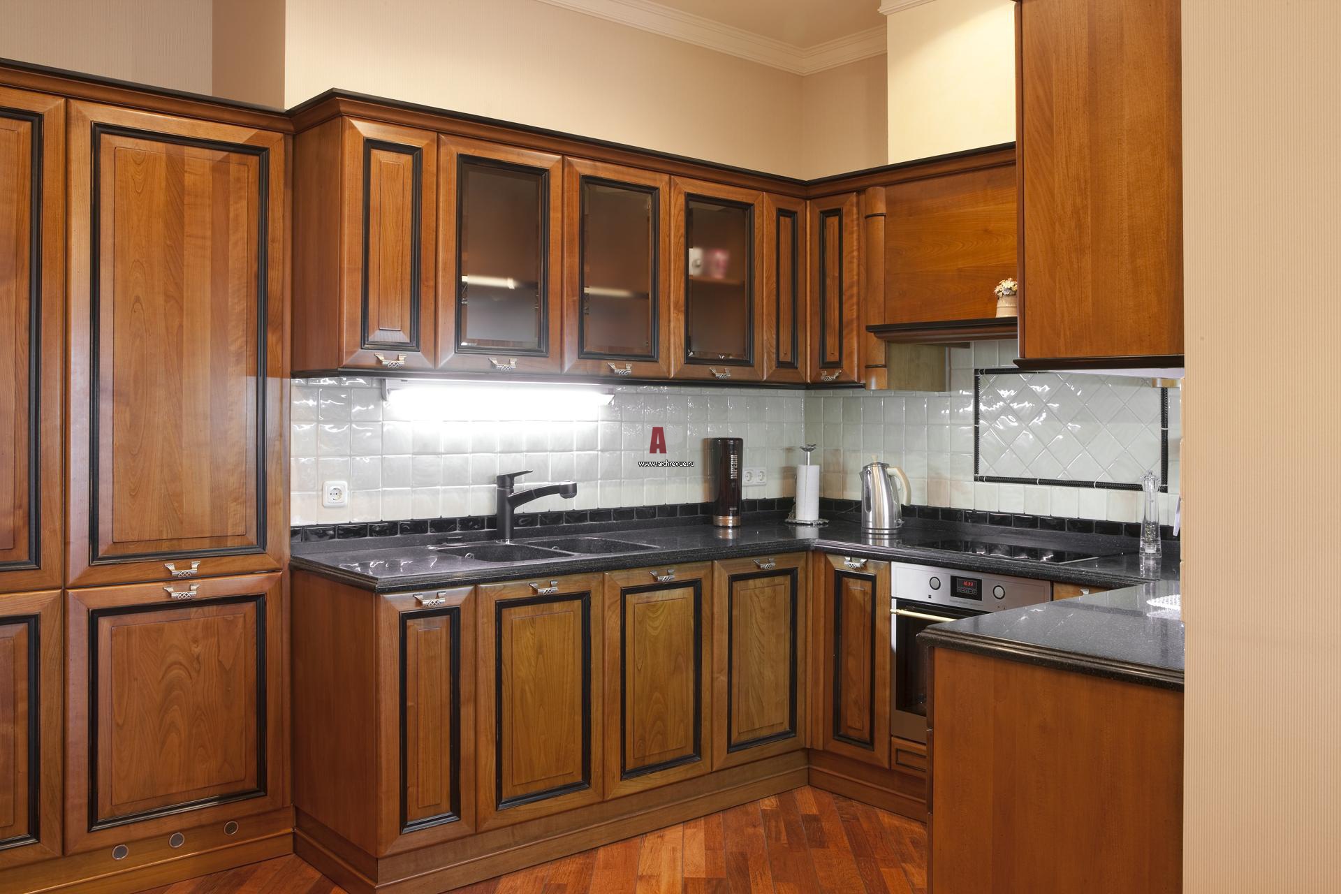 В основе подбора мебели оказался кухонный гарнитур, понравившийся заказчику. Богатые деревянные фактуры, графичность рисунка, некоторая массивность подсказали стилистику остальной меблировки.
