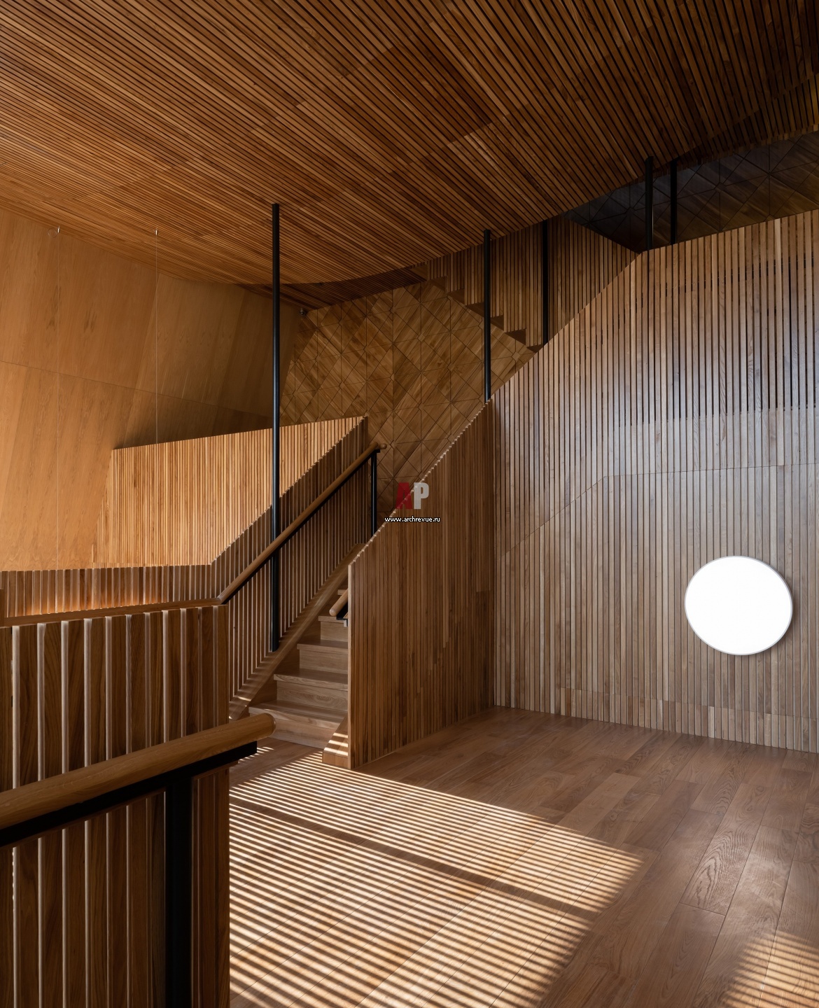 Центр гостеприимства в парке «Кудыкина гора» включает объемы разной этажности, максимальная высота – три этажа. Этаж соединяют деревянные лестницы.