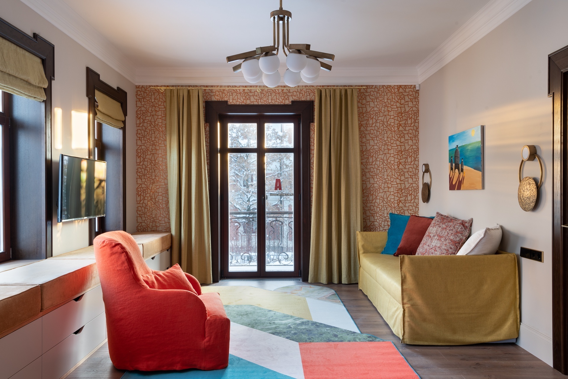 Дом для выходных и праздников. Детская на втором этаже. Яркие обои с активным рисунком, York Wallcoverings. Диван и кресло, Meridiani. Разноцветный ковер, Kartell.