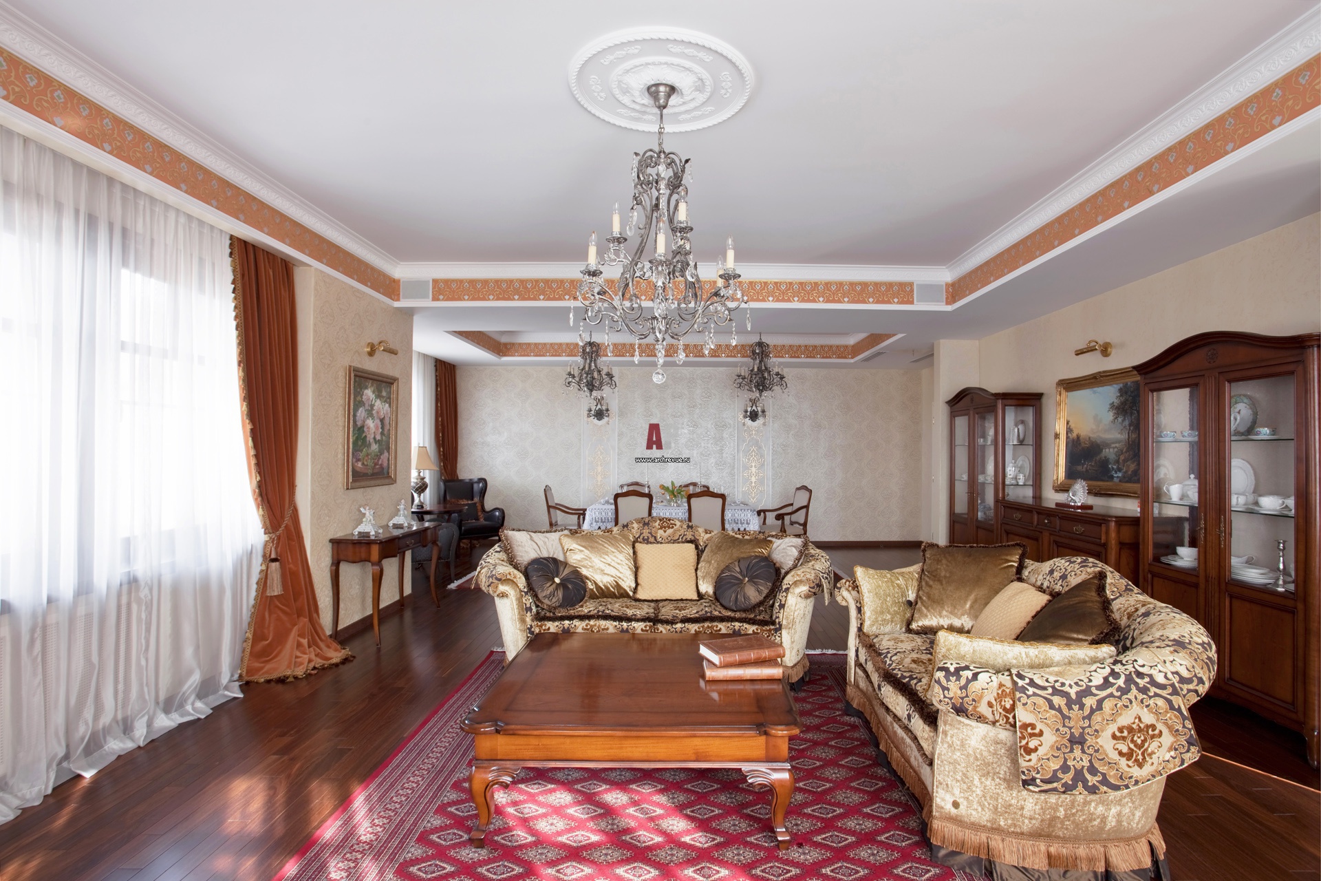 Классическая диванная группа в гостиной. На полу – доска из массива сукупиры. Кованые светильники из патинированного серебра зонируют помещение.