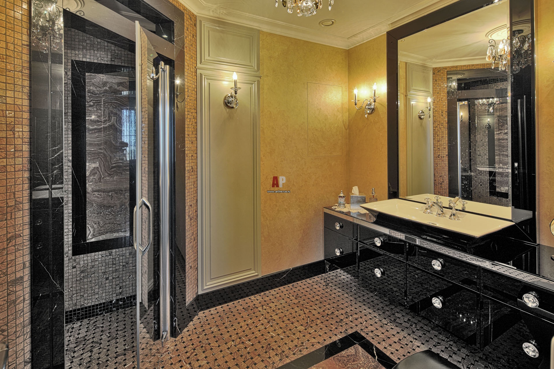Фото интерьера ванной комнаты с мраморной мозаикой.