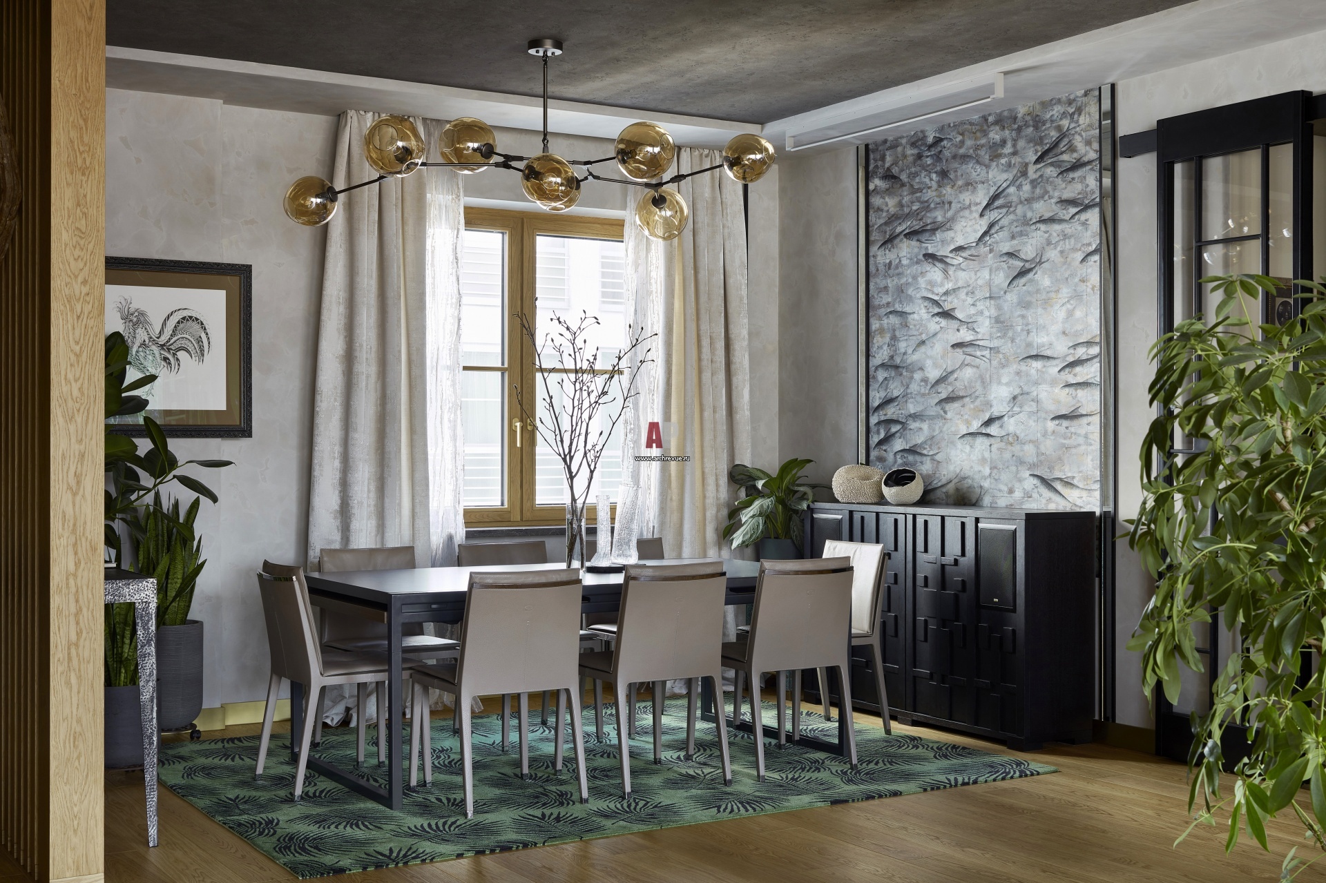Парадная столовая с изумрудно-зеленым ковром в общей гостиной. Обои с рыбками, De Gournay. «Китайский» комод с выдвижным механизмом для ТВ сделан по эскизам дизайнера. Люстра, Creative Lighting.